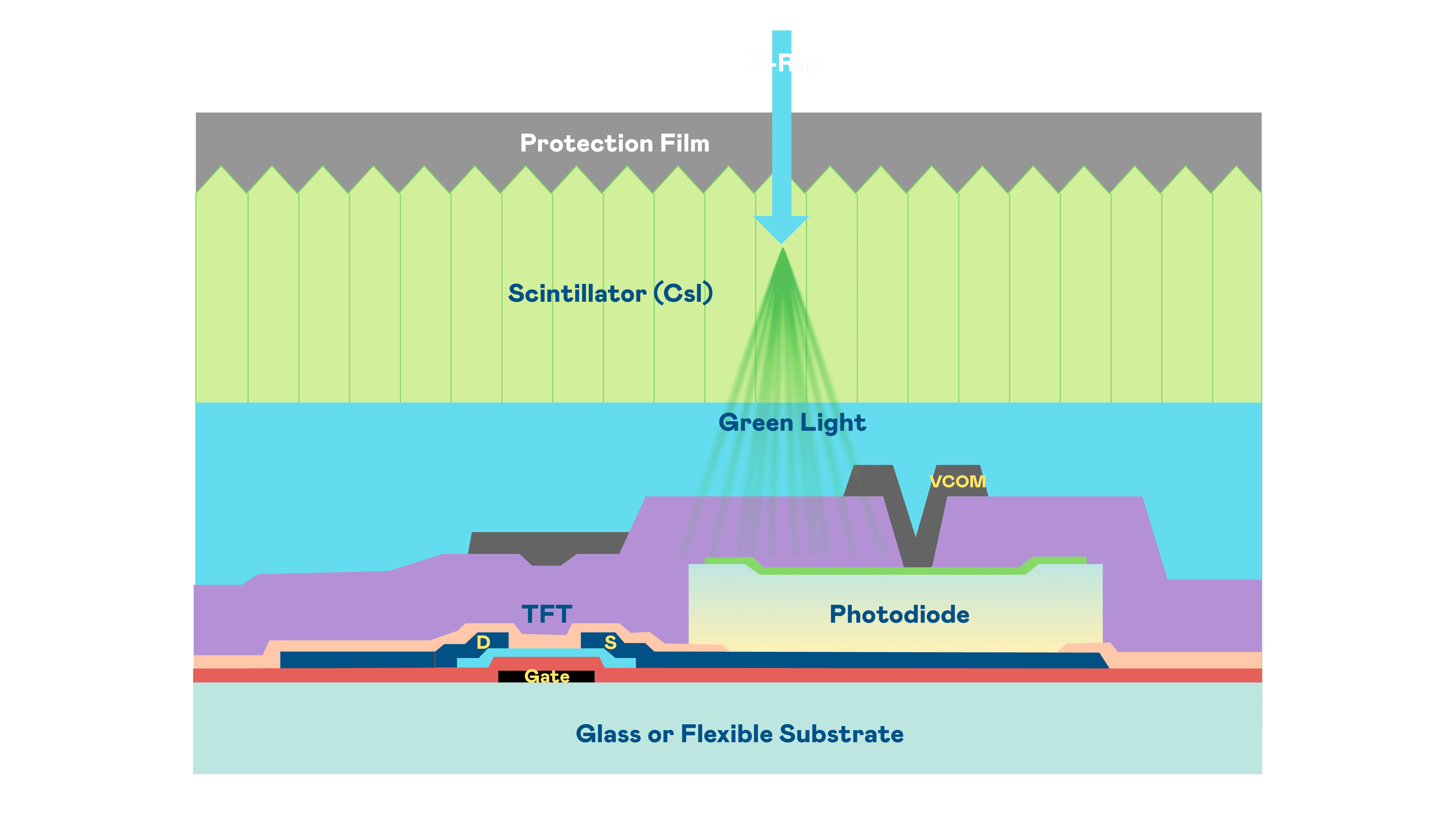 人生就是博的X光影像感测阵列使用薄膜电晶体 (TFT) 作为每个像素的读取开关,,,搭配光电二极体(Photodiode)的光电转换元件,,,,用以感测X光影像讯号。。。